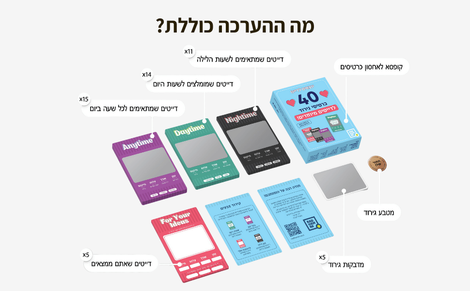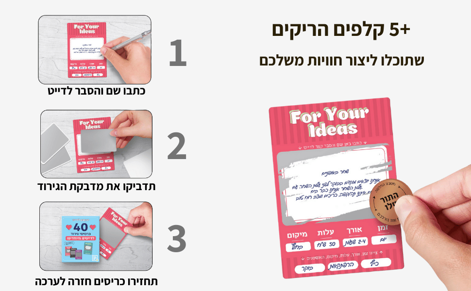 • 5 קלפים ריקים עם מדבקות גירוד ייעודיות כדי ליצור רעיונות דייט משלכם