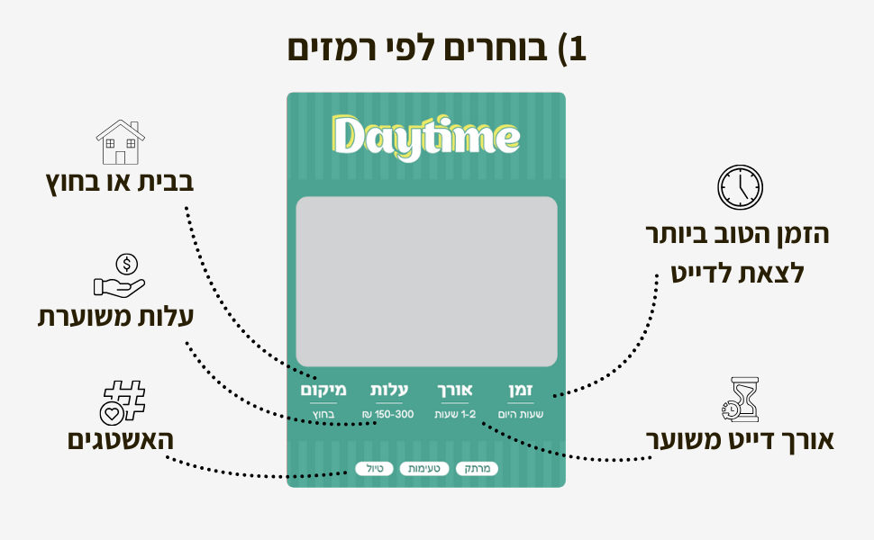 בחרו בתבונה: היעזרו ברמזים שבתחתית הכרטיס כדי להבין את סגנון הדייט (בבית/בחוץ, יום/לילה, עלות ואורך הדייט) עוד לפני שאתם מגרדים.